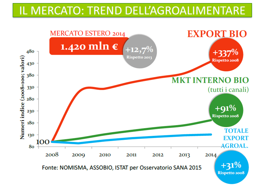 L’agenzia ITA (Italian Trade Agency dell’ICE), in occasione di Sana, il salone internazionale di settore, ha promosso uno studio curato da Nomisma per fornire uno spaccato della situazione attuale e per individuare i trend e potenzialità dei mercati esteri e punti di forza. Inoltre i centri ITA hanno a loro volta fornito un focus sull’agroalimentare biologico italiano all’estero. Un’analisi dei marchi, del posizionamento, dei vincoli dei singoli paesi, volto a supportare ed indirizzare nello specifico le strategie di business degli operatori di settore.