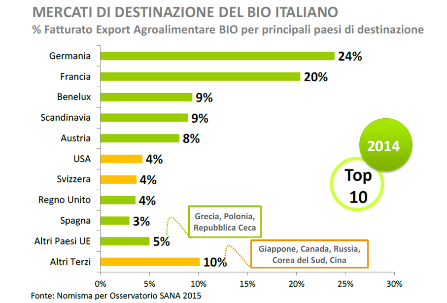 La Germania rappresenta il primo mercato per i prodotti agroalimentari bio italiani (24% sul totale del fatturato estero realizzato nel 2014), seguita dalla Francia (20%). Altri mercati rilevanti per il bio Made in Italy sono: Belgio, Paesi Bassi e Lussemburgo (circa il 9% del fatturato export) e la Scandinavia (con anch’essa il 9%). A seguire Stati Uniti (4%), Svizzera (4%), Giappone (3%) e Canada (2%).