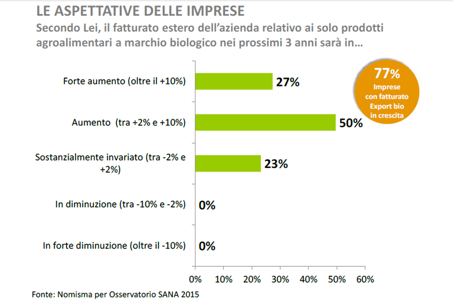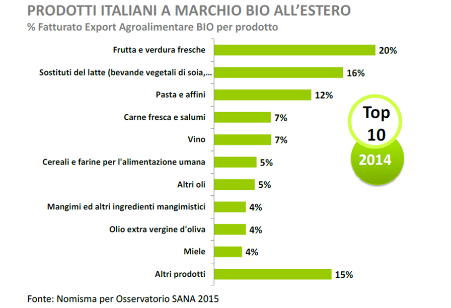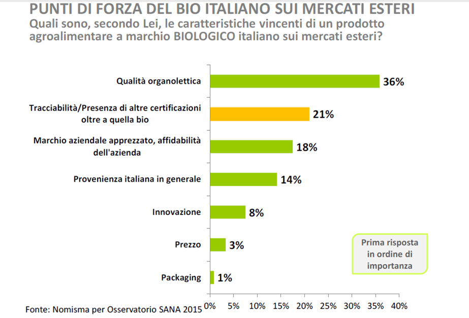 mentre la provenienza italiana in generale arriva solo al quarto posto della scala dei valori bio. Negli obiettivi delle aziende italiane vi è quella di utilizzare il brand Made in Italy come valore aggiunto anche per i mercati esteri, senza trascurare i primi tre punti essenziali. Inoltre, cresce la propensione all’esportazione, non solo per il maggiore giro d’affari estero, ma anche per la ricerca di maggiori margini, oggi fortemente compressi in Italia.