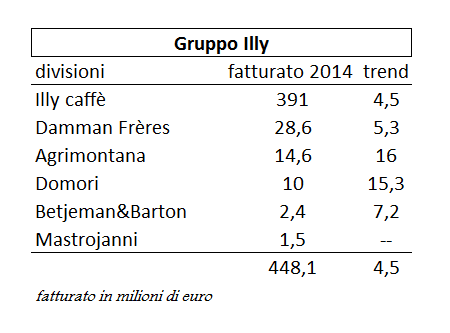 Il Gruppo Illy, una solida storia e una profonda esperienza nel caffè, da qualche tempo ha allargato i suoi interessi con acquisizioni diverse: Domori (cioccolato, interamente controllata), Mastrojanni (vino, interamente controllata), Damman Frères (tè, di cui detiene il 77%), Betjeman & Barton (accessori da tè, di cui detiene il 50%), Agrimontana (pasticceria, di cui detiene il 50%) e Grom (gelati, di cui deteneva il 5%) da poco uscita da Gruppo, a seguito dell’acquisizione della restante quota da parte del Gruppo Unilever.