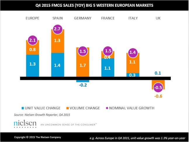 I volumi delle vendite dei prodotti della grande distribuzione in Europa risultano quindi, secondo lo scenario Nielsen, essere in crescita poiché i consumatori si avvantaggiano del più basso tasso di incremento storicamente registrato dai prezzi. Nello stesso tempo, per il settimo trimestre consecutivo, la quantità venduta di articoli – alimentari, bevande e prodotti per la persona. ecc. – ha fatto registrare una crescita anno su anno.