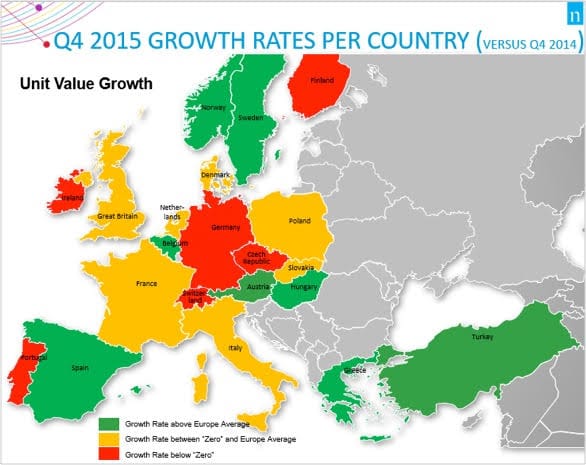 La Spagna con una crescita del +2,7%, ha fatto registrare il tasso nominale più elevato, prima di Germania e Francia che si sono fermate entrambe a +1,5%. Solamente quattro dei Paesi europei hanno visto un declino nella crescita nominale: Svizzera -2,3%, dovuta soprattutto al crollo dei prezzi -1,6%; Finlandia -1,1%, UK -0,5% e Slovacchia -0,2%. Altri paesi hanno visto il verificarsi di fenomeni di deflazione: Irlanda, Germania e Repubblica Ceca, mentre Portogallo ha subito un vero e proprio crollo dei prezzi -1,3%. Dall’altra parte invece, i paesi con crescita più elevata sono stati: Turchia +9,2% il suo tasso nominale, Ungheria con un aumento dei prezzi a +3,1% e tasso nominale al +5,5%, infine Svezia con un tasso nominale +4,9% e Grecia +4,8%.
