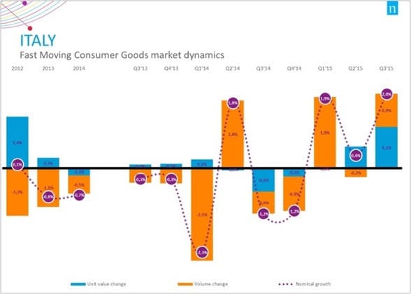 I volumi di vendita dei beni di largo consumo su scala europea sono in aumento dello 0,8% con una crescita continua anno su anno, mentre i prezzi sono cresciuti solo dell’1,3%, il dato più basso registrato a partire dal terzo trimestre 2010 che era +1,1%. Di conseguenza i distributori hanno assistito a un incremento degli incassi pari al 2,1% (incremento dei volumi + incremento dei prezzi). In Italia la crescita nominale registrata nello stesso periodo è stata dell’1,4% rispetto allo stesso trimestre del 2014, grazie a una crescita dei volumi pari all’1,1% + crescita dei prezzi pari allo 0,3%, secondo appunto i dati Nielsen Europa.
