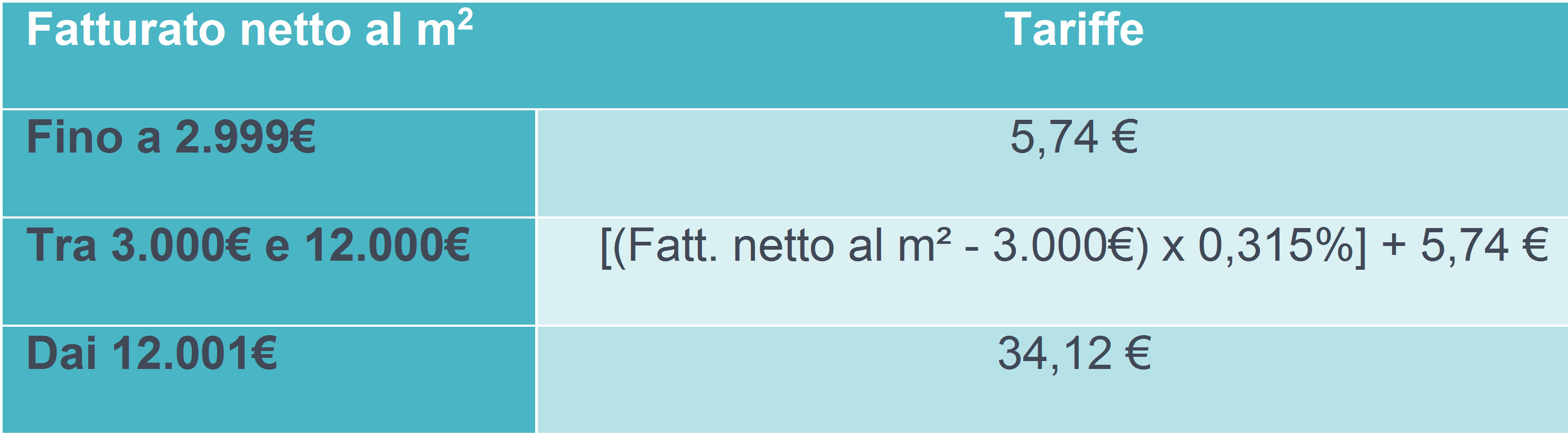 L’importo lordo è calcolato moltiplicando una determinata tariffa (v. tabella 1) alla superficie totale di vendita al dettaglio; questa tariffa è in funzione del fatturato netto per m2 espresso dal singolo punto vendita.