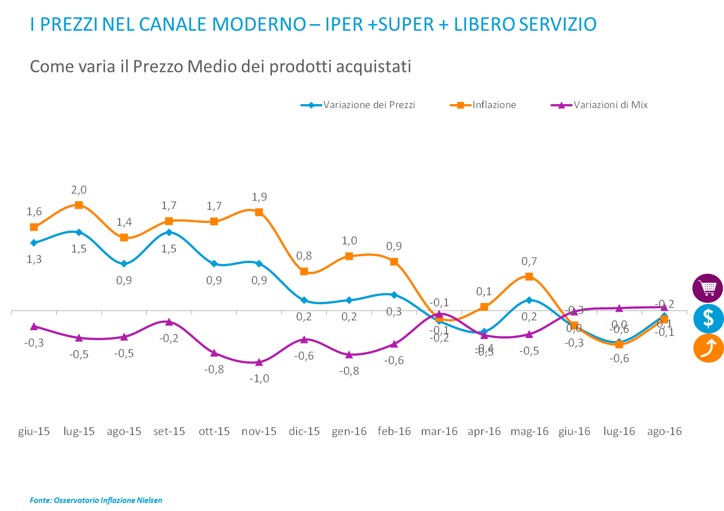 Il mese di agosto vede ancora una riduzione del mix acquistato (-0,2%), in presenza sia di un leggero calo dell’inflazione (-0,1%) che dei prezzi (-0,1%).