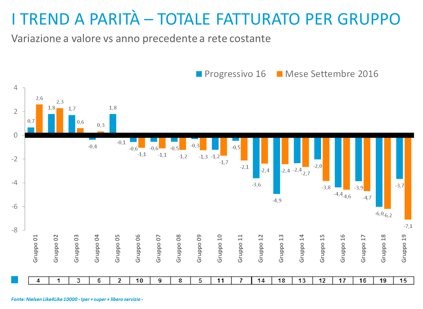 Come avevo anticipato, agosto lo si può definire un risultato di “rimbalzo”, certamente ottenuto grazie ad una buona stagione estiva; ne è riprova il fatto che nel mese di settembre il risultato positivo viene raggiunto solo da 4 gruppi e con risultati che variano dal +0,3% al +2,6%.