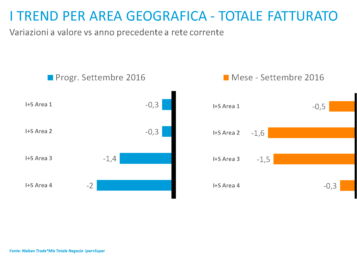 Di positivo c’è che dopo essere rimasta, il mese scorso, l’unica Area in territorio positivo, a settembre è quella con il risultato meno negativo. Tutte le altre, infatti, segnano risultati ancora più deludenti.