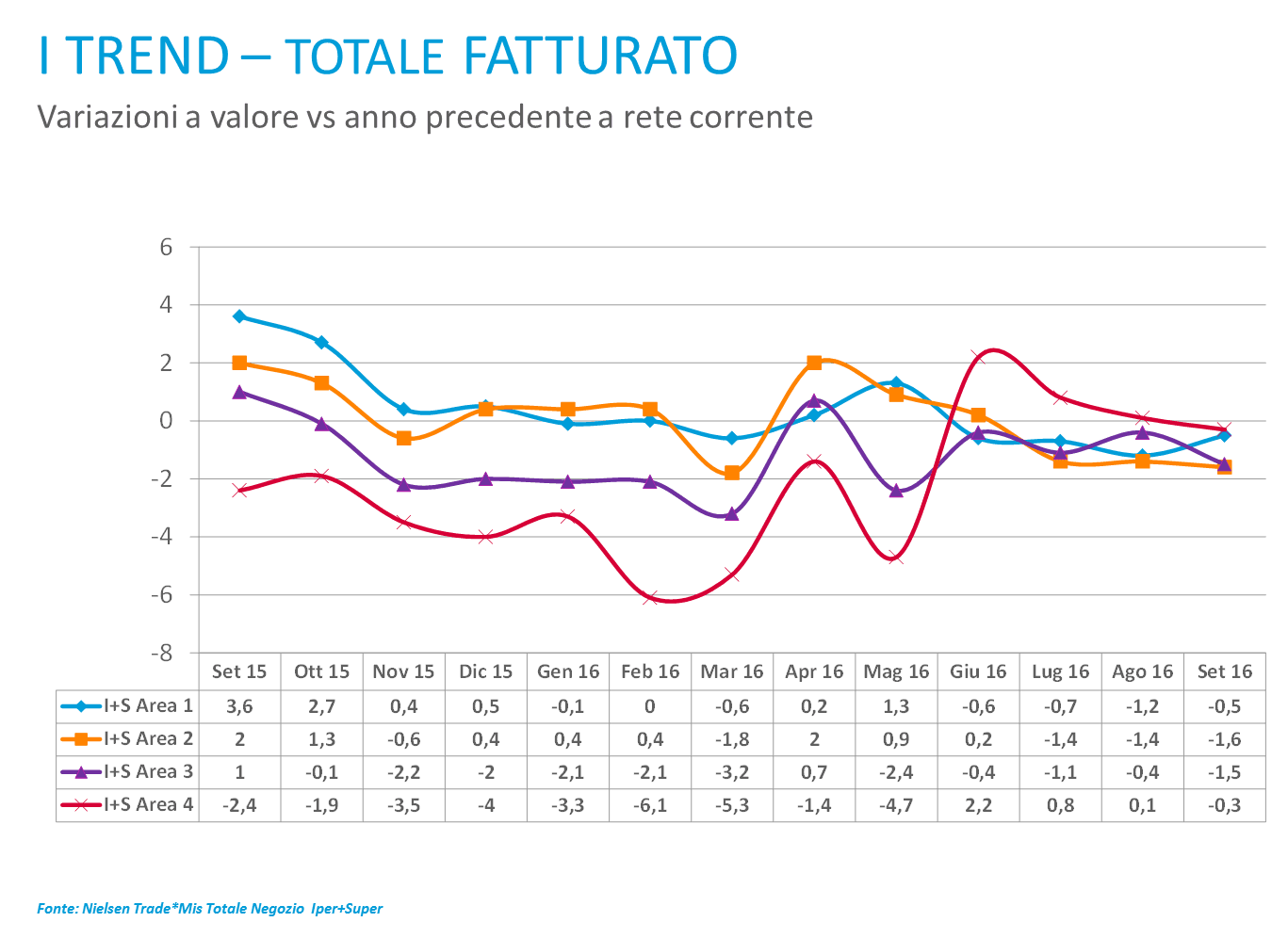 Il grafico dei trend mostra tutte le aree in negativo con Area 1 che recupera sul mese di agosto.