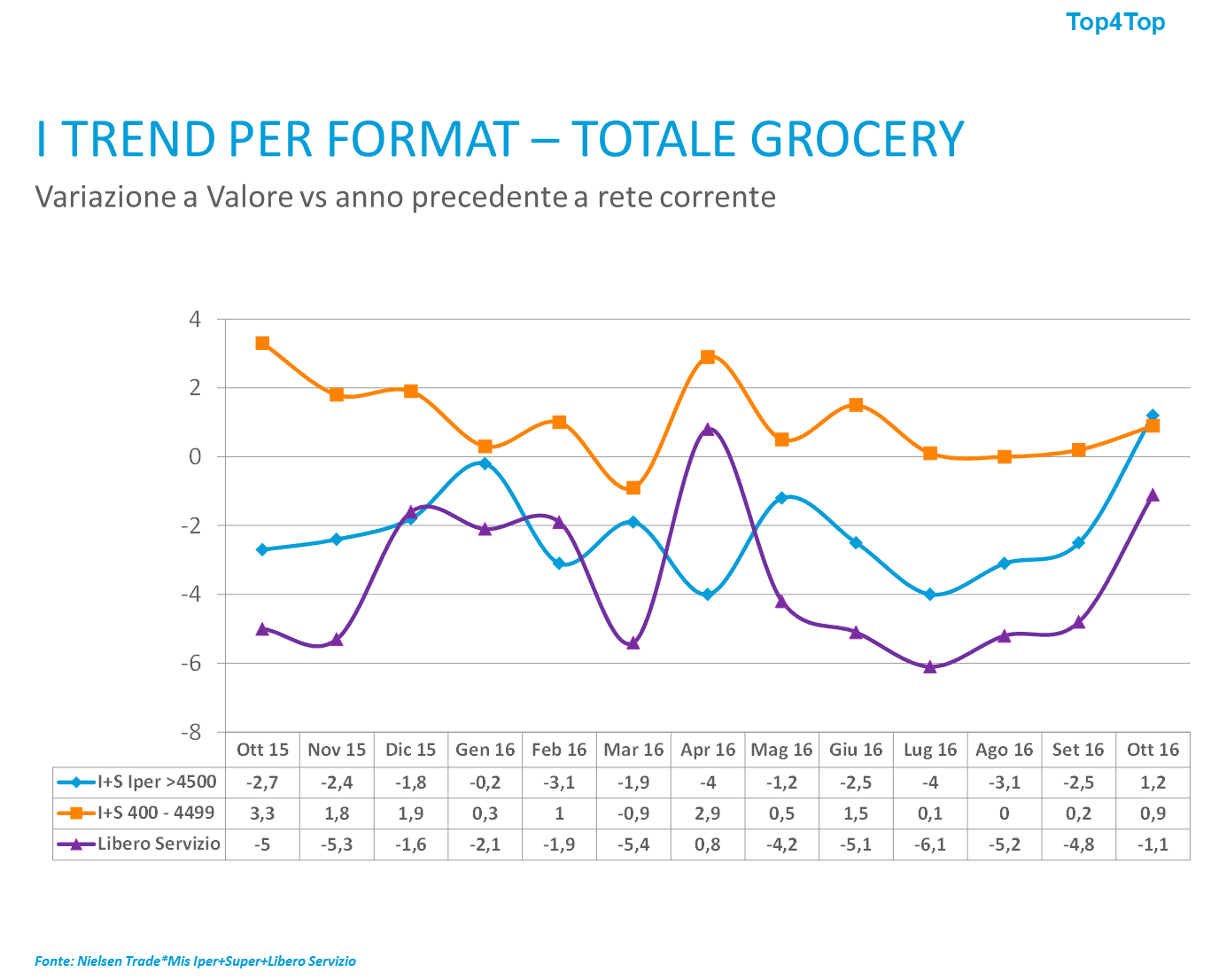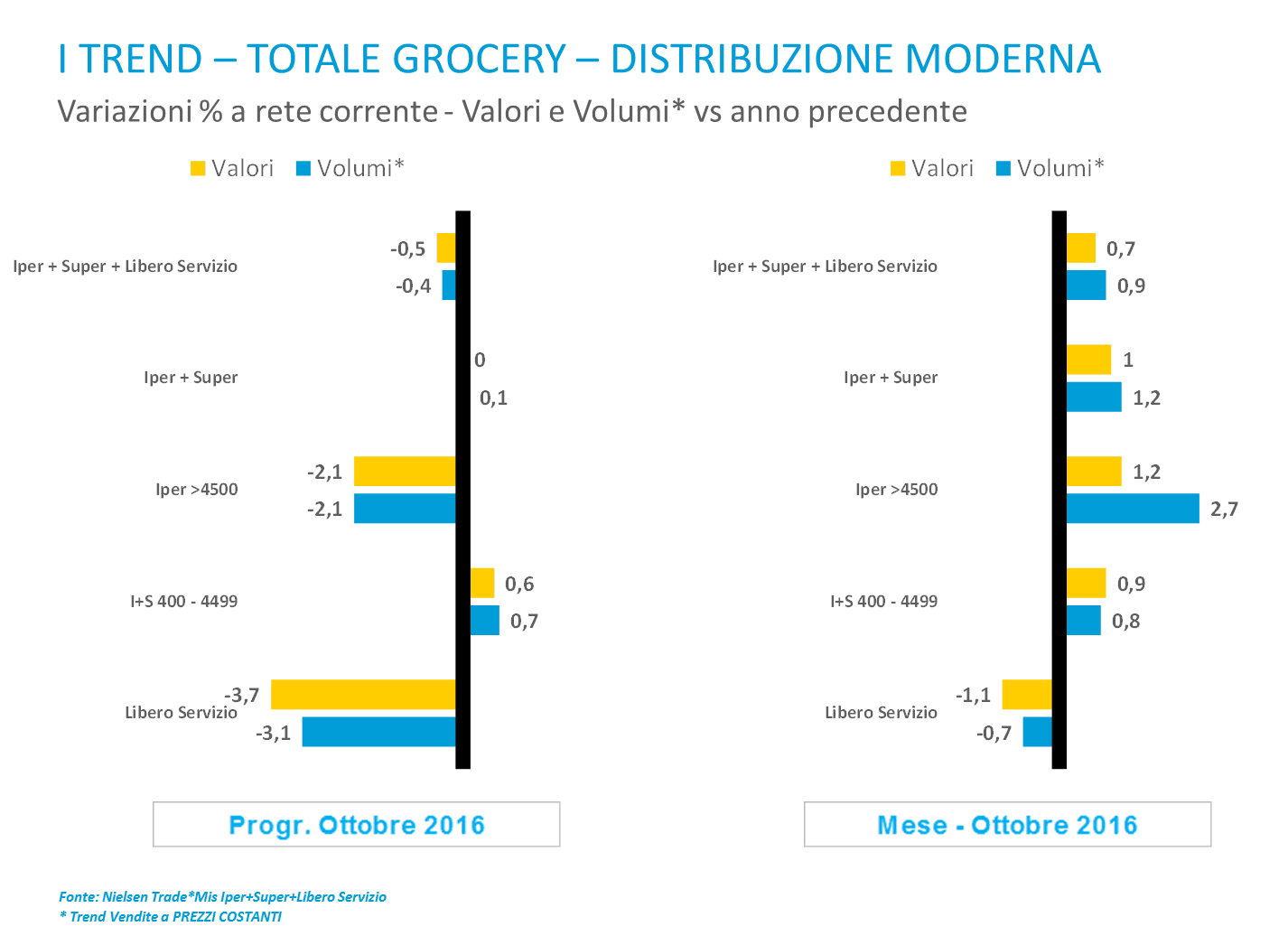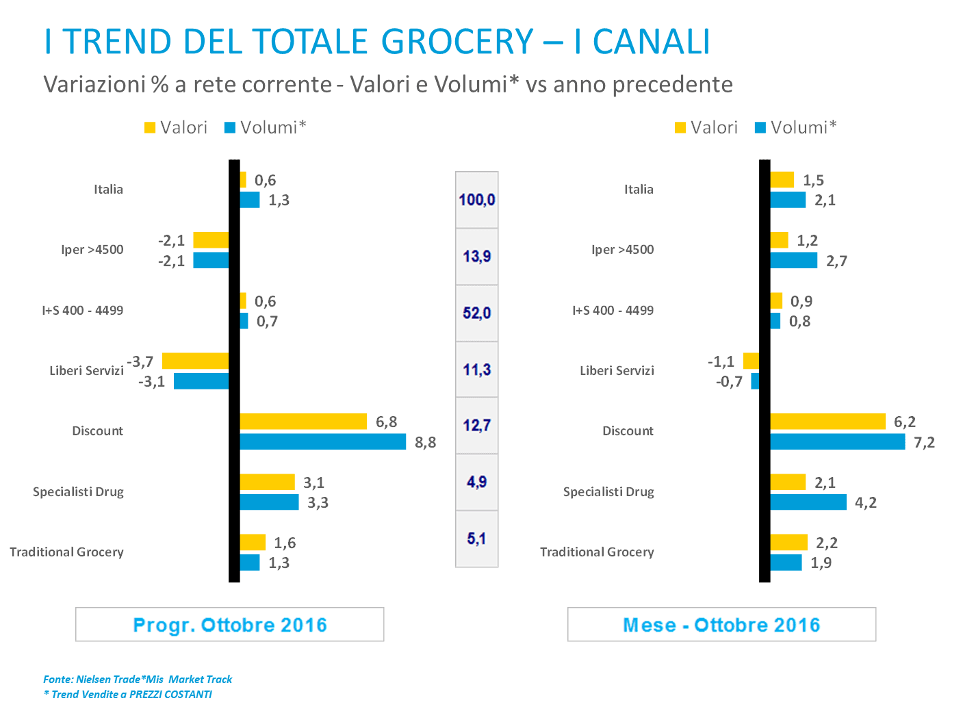 Il canale Tradizionale, similmente ai Discount, cresce ma meno di settembre (+2,2% vs +4,7% a valore e +1,9% vs +3,7% a volume).