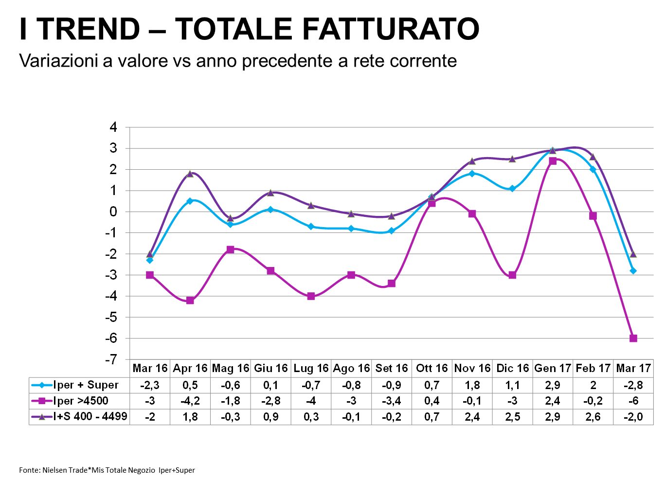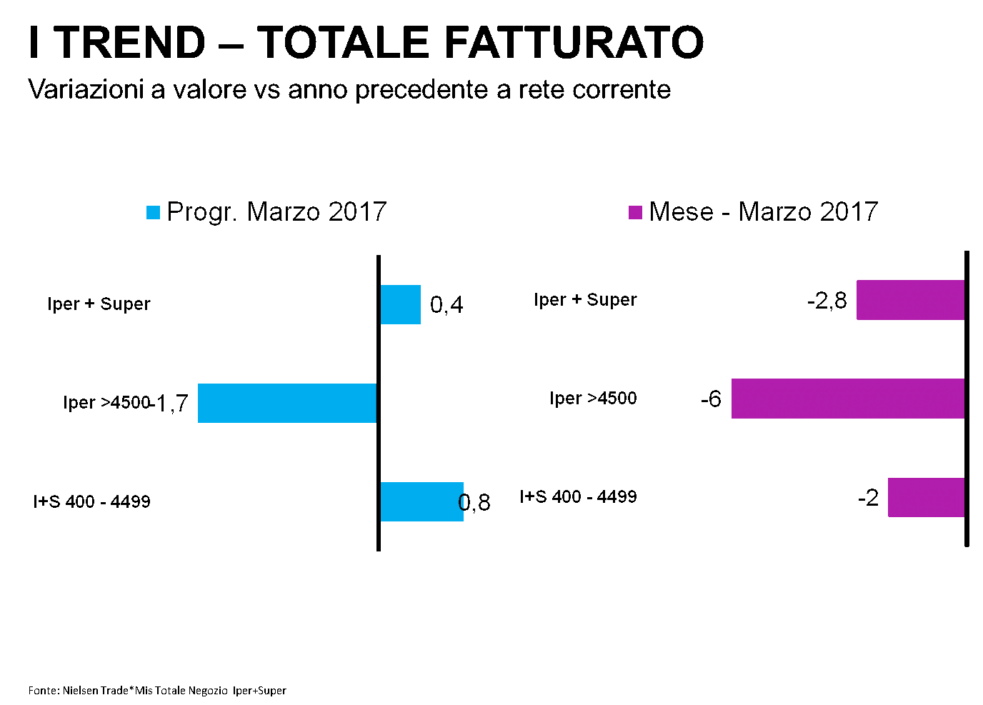 Marzo risente in maniera diretta della Pasqua 2016. Quindi i dati saranno quasi sempre negativi e solo con il consuntivo di aprile (a progressivo) avremo la situazione reale. Ciò premesso, marzo mostra un dato molto negativo sia per la parte dei Grandi Iper (-6%) che per gli I+S 400-4499 (-2,0%); l’insieme I+S segna il -2,8%.