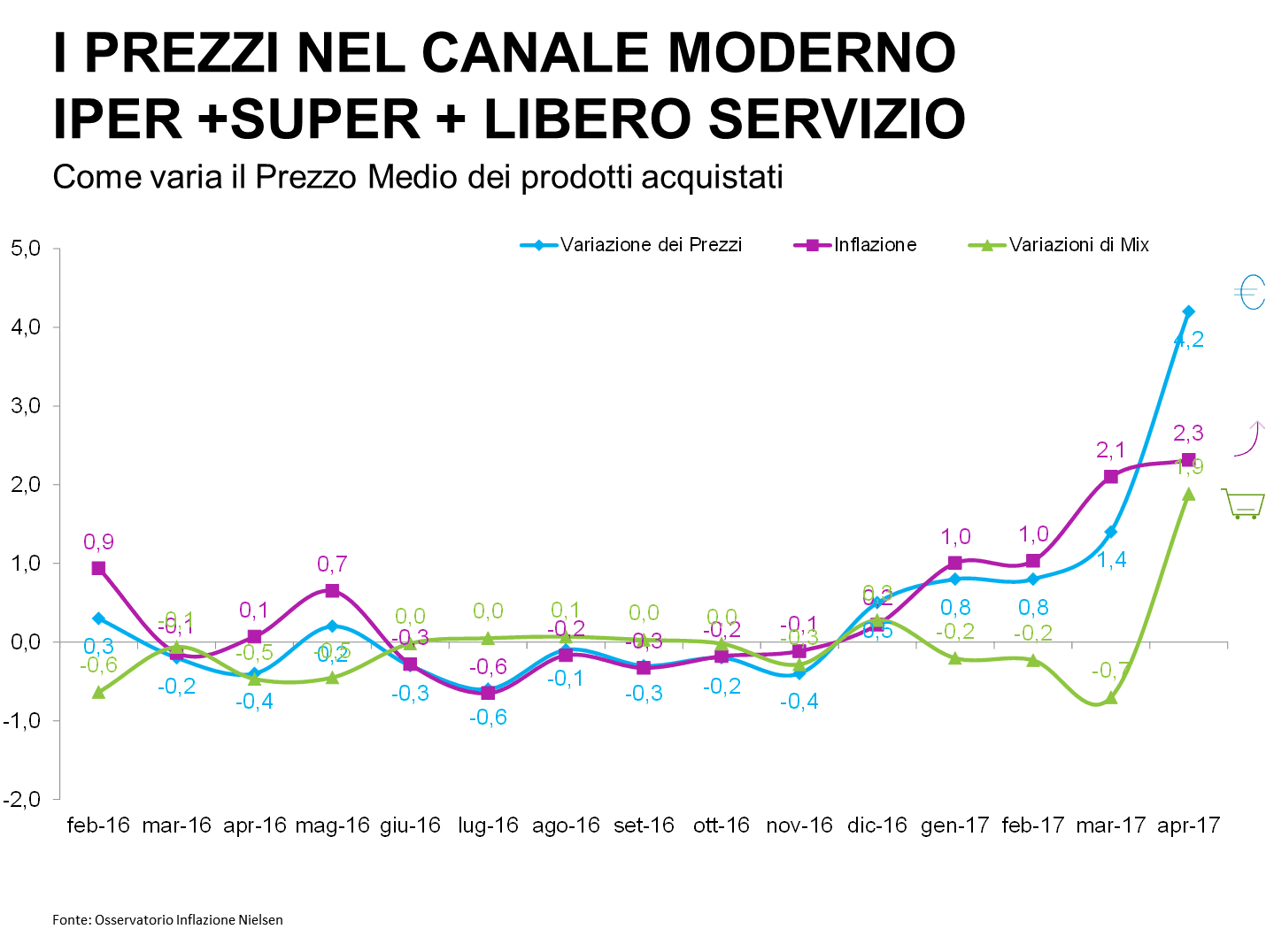 Dopo aver assistito negli ultimi tre mesi al definitivo ritorno dell’inflazione, ad aprile i consumatori si sono sbilanciati moltissimo anche in termini di approccio al consumo. Il mix acquistato, infatti, presenta un’impennata che non ha precedenti negli ultimi due anni, passando dal cauto -0,7% di marzo al +1,9% di aprile. Da parte sua, l’inflazione segna un +2,3%, leggermente in aumento rispetto a marzo (+ 0,2pp).
