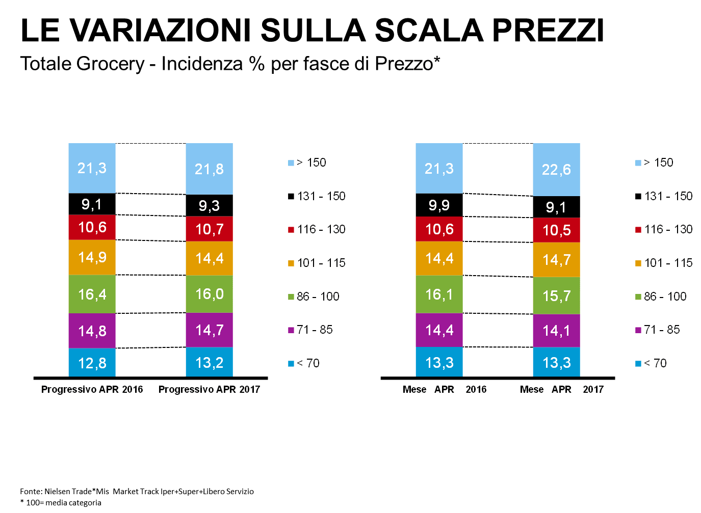 Nel mese di aprile, visti i dati di incremento prezzi e mix consumi, non stupisce affatto che l’unica scala prezzi che ride (e ride sul serio) sia quella >150. Cresce in un solo mese di 1,3pp e, nel progressivo, di 0,5pp. La quota raggiunta è pari al 22,6% che, unita alle quote delle altre due fasce Premium (>116 fino a 150), arriva a far pesare il comparto al 42,2% del Mercato.