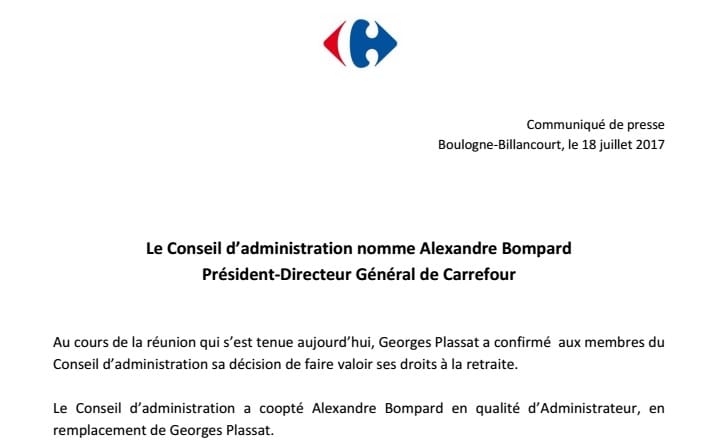 Si deve a Plassat la svolta BIO dell’azienda che ha portato ad un importante approfondimento di questo segmento, soprattutto nelle strutture di prossimità, si deve sempre a lui l’approfondimento de la proximitè ed il ritorno al tradizionale con il dominio dell’insegna Carrefour, declinata in tutta la sua offerta. E sotto la gestione di Plassat si è sviluppato il segmento e-Commerce dell’azienda. Ha portato stabilità e modernità all’azienda, allontanandola dagli slanci avveniristici di Oloffson, troppo ottimistici per una azienda complicata come Carrefour. Era però da tempo nell'aria la possibilità di un cambio al vertice dell’azienda, Carrefour è un player di portata mondiale e i grandi Players compiono grandi manovre, come ben si sa, e così è stato: nel corso di una riunione tenutasi il 18 Luglio, Georges Plassat, direttore generale di Carrefour France ha confermato al Consiglio di Amministrazione la sua decisione di esercitare il suo diritto di andare in pensione (questa è stata la versione del comunicato stampa emesso dall'azienda a tutte le redazioni, noi compresi). Il Consiglio di Amministrazione ha nominato in sua sostituzione Alexandre Bompard. “Il CdA ha ribadito il suo profondo apprezzamento nei confronti di Georges Plassat per il lavoro svolto nel corso degli ultimi cinque anni e per il recupero di efficienza con cui lascia l’azienda.” Arrivederci.