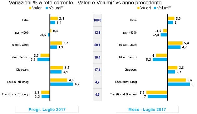 Il Libero Servizio è il canale dove il Grocery perde di più e la ragione è evidente: la specializzazione dei punti di vendita di prossimità si deve rivolgere ai freschi, ed ancor più ai freschi locali. E’ interessante la tenuta del canale Iper, così come la crescita del Discount di cui dopo si parlerà. Il mese di Luglio ha visto una crescita del fatturato più che proporzionale, rispetto alla media degli ultimi mesi in riferimento ai medesimi dello scorso anni, evento che potrebbe essere dovuto al clima particolarmente caldo del mese di Luglio, rispetto al 2016. Invece per quello che riguarda gli specialisti Drug è possibile ipotizzare la crescita della rete che prosegue sostenuta, considerando che i nuovi format hanno sempre più rilevanti dimensioni che permettono incrementi di assortimenti.