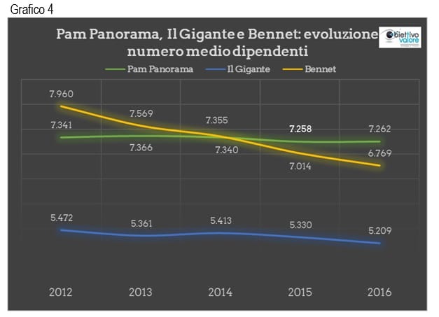 Pam, cimentandosi in un formato più piccolo, non ha potuto abbassare la numerica degli addetti ed ha sostanzialmente mantenuto la numerica negli anni.
