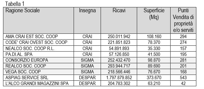 Si analizza, di seguito, l’andamento del giro d’affari dei principali attori del nord Italia delle insegne CRAI, Sigma e DESPAR (Tabella 2):
