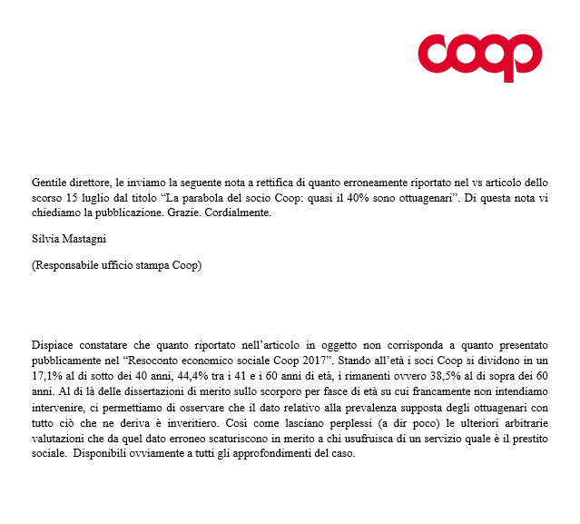 La doverosa ratifica determinata da motivazioni di rendering che rendevano evidente e sorprendente quanto riportato in prima istanza (a sostegno del concetto che ciò che riceviamo lo studiamo a fondo). Alla luce della necessaria e giusta richiesta di rettifica di Coop viene comunque da pensare che, a nostro avviso, il dubbio su una composizione anagrafica dei soci fortemente propendenti verso la terza età (sebbene non come riportato in prima istanza) è comunque un problema che Coop deve risolvere.