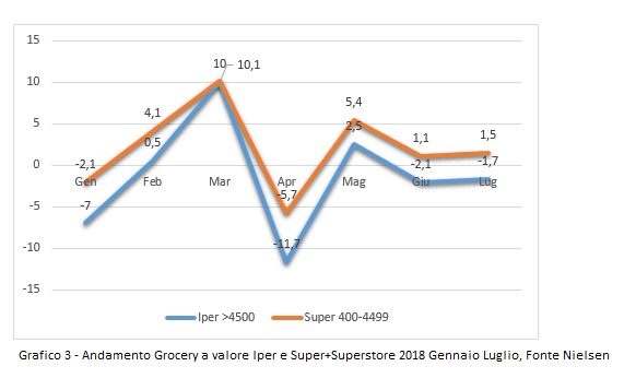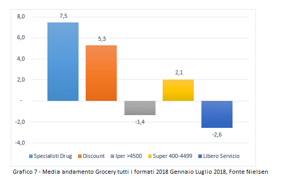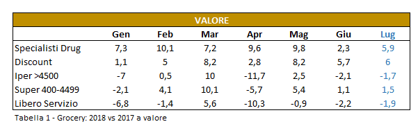 Il mese di Luglio nel comparto Grocery (tabella 1 sopra) gli Ipermercati hanno lasciato sul campo il -1,7% rispetto al 2017.