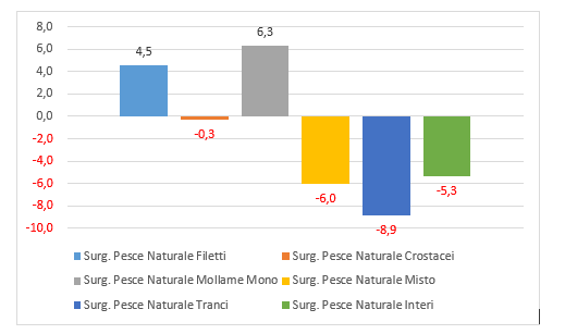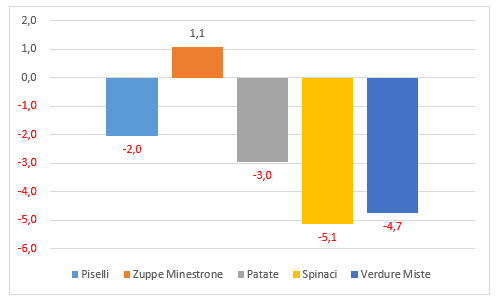 I due grandi segmenti del congelato sono quello dei surgelati di pesce e quello dei surgelati vegetali. Queste due grandi aree occupano la maggior parte dello spazio del frozen sebbene i numeri che stanno attorno a questi segmenti siano impietosi.