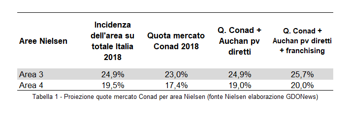 L’area 3, secondo GNLC, produce il 24,9% del fatturato di tutta Italia. Conad, in questo territorio, aveva una quota territoriale pari al