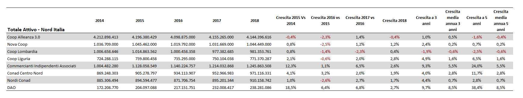 Come si vedrà la differenza tra l’analisi delle quote di mercato e dei singoli fatturati è molto marcata: le prime sono il risultato di una attività dinamica che coinvolge tutte la aziende della Grande Distribuzione, perché si tratta di suddividere una grande torta (il fatturato dell’insieme delle imprese che operano in GDO) in tante piccole fette determinate a seconda del loro fatturato, fette che cambiano tra loro all’evolversi di ogni singola situazione. Il confronto dei fatturati tra cooperative, invece, è una analisi specifica delle loro prestazioni, indipendentemente dalle loro quote.