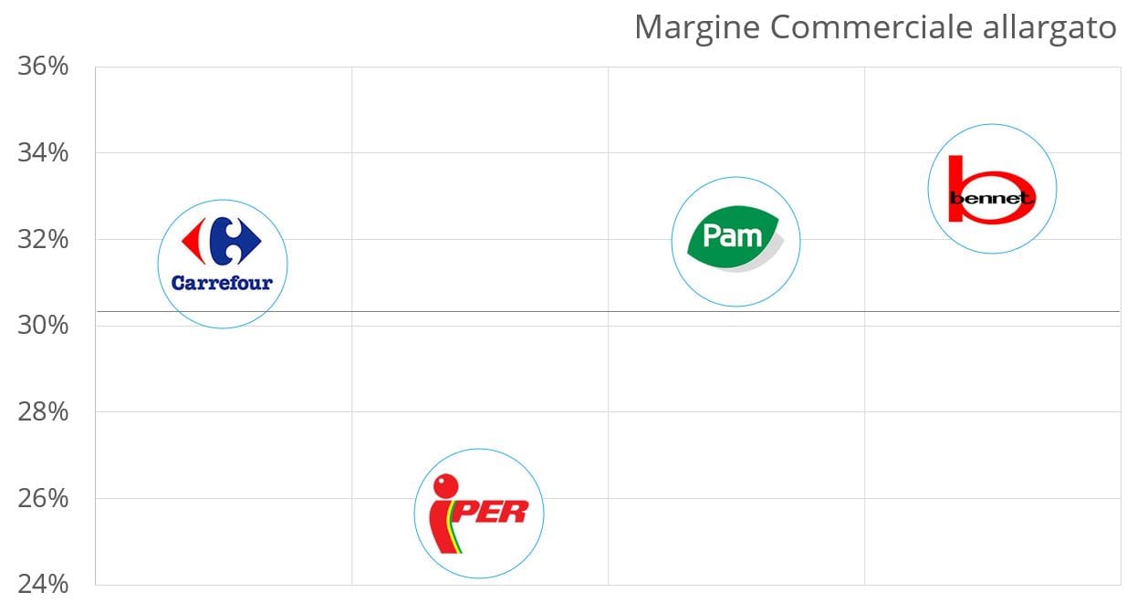 Il margine commerciale allargato del benchmark, ovvero la differenza tra le vendite ed il costo della merce, ci consegna una media del