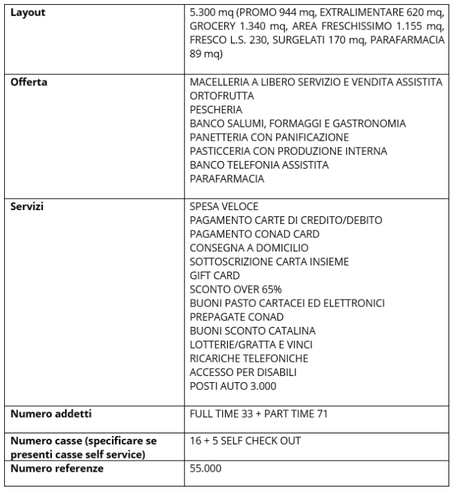 Nel punto vendita sono attive 21 casse di cui 5 self check-out. I clienti potranno usufruire di un parcheggio di oltre 3 mila posti auto. Sono 104 gli addetti impiegati.