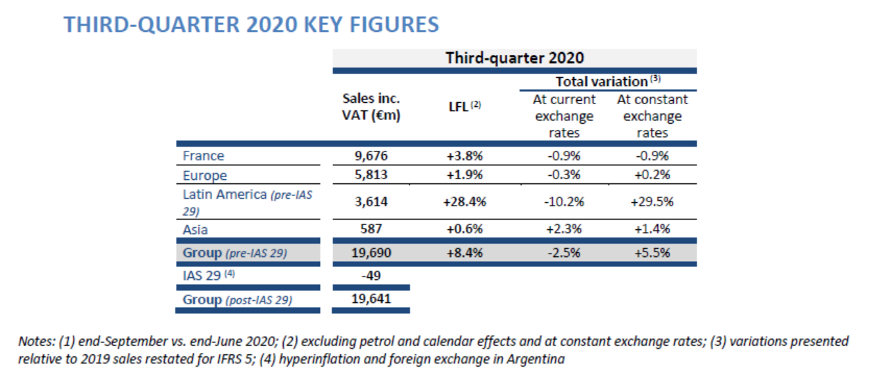 Ebbene le vendite lorde del terzo trimestre sono aumentate dell’8,4% a rete costante. Le vendite lorde del Gruppo ammontano a 19,6 miliardi di euro, in aumento del + 5,5% a cambi costanti. Questo aumento include un la deflazione del costo dei carburanti del -2,9%. Tenuto conto di un effetto cambio sfavorevole del -8,0%, dovuto principalmente al deprezzamento del Real brasiliano e del Peso argentino, la variazione complessiva delle vendite a cambi correnti è pari a -2,5%.