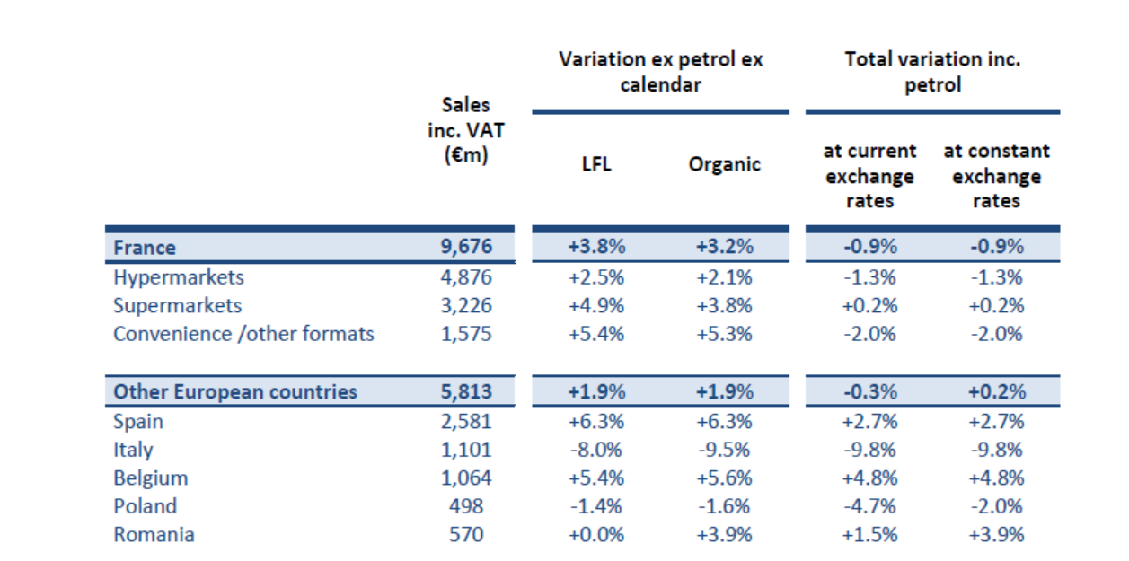 In Spagna (+ 6,3% LFL), il Gruppo ha confermato il suo ottimo slancio in un mercato vivace. Carrefour si distingue per un interessante modello commerciale (prodotti freschi e a marchio Carrefour, prezzo posizionamento) e un miglioramento continuo della soddisfazione del cliente.