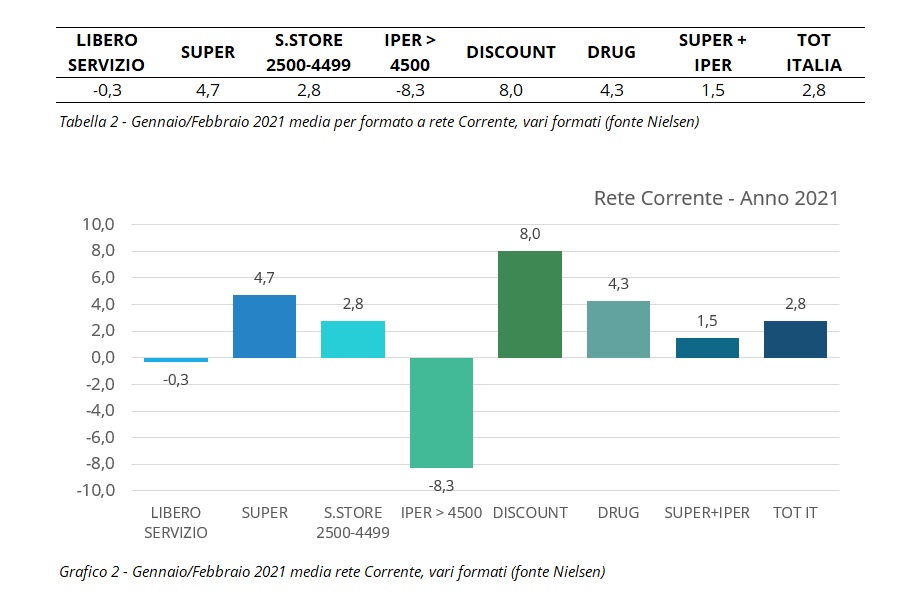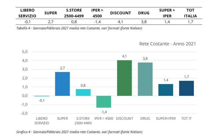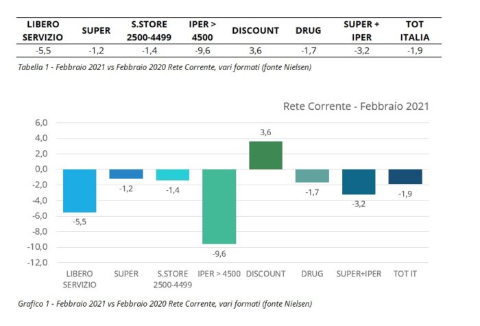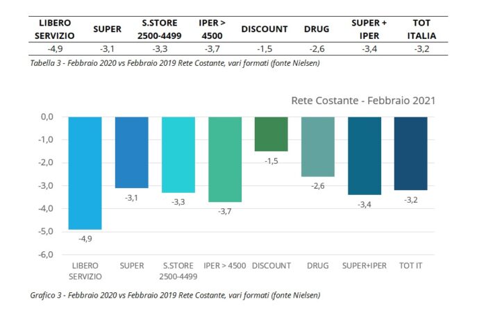 A rete costante il risultato negativo ha coinvolto tutti i formati di vendita, sebbene è utile svolgere alcune riflessioni: il discount, che è cresciuto con le nuove aperture, a parità ha segnato un risultato negativo (-1,5%); gli ipermercati, invece, hanno realizzato un negativo decisamente più contenuto (-3,7%) rispetto a quello registrato a rete corrente. Appare chiaro che la salvezza del format discount sia da ritrovare nelle strategie che i maggiori player stanno attuando, dove gli investimenti in nuove aperture sono ingenti, da nord a sud, e vedono le quattro grandi aziende estendere la loro rete in modo massivo. Per gli ipermercati i dati riportati cosa fanno intendere? che la numerica dei punti vendita del febbraio 2020 non sono quelli del 2021, infatti invece che aumentare i negozi oltre i 4500 mq stanno diminuendo, ecco perchè il negativo è inferiore.