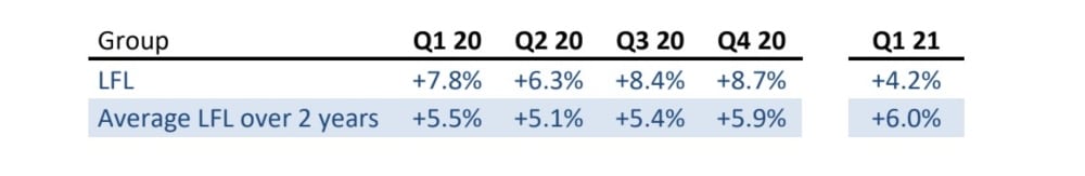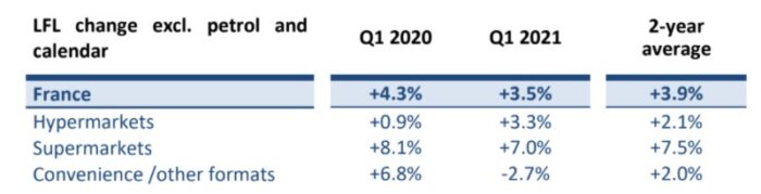 Nel primo trimestre del 2021, Carrefour ha registrato una solida crescita del LFL del + 4,2%, una crescita media del LFL del + 6,0% in 2 anni, nonostante una base comparabile eccezionale legata all’inizio della crisi sanitaria nel marzo 2020.