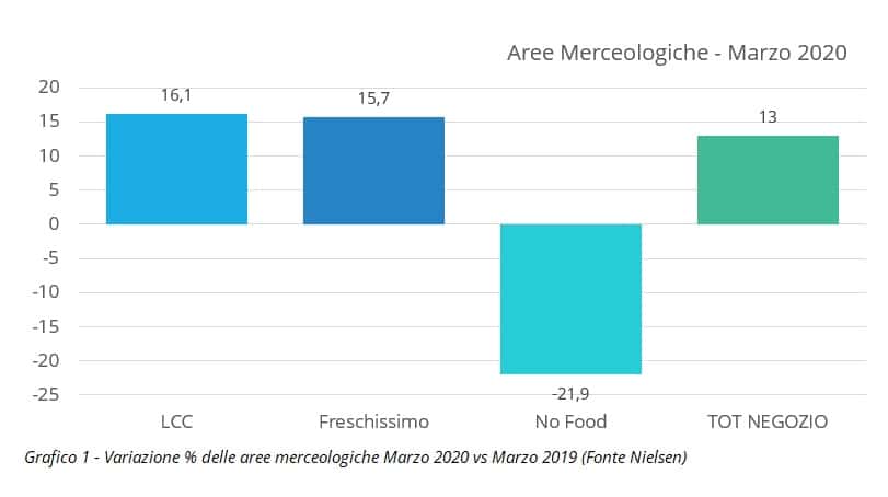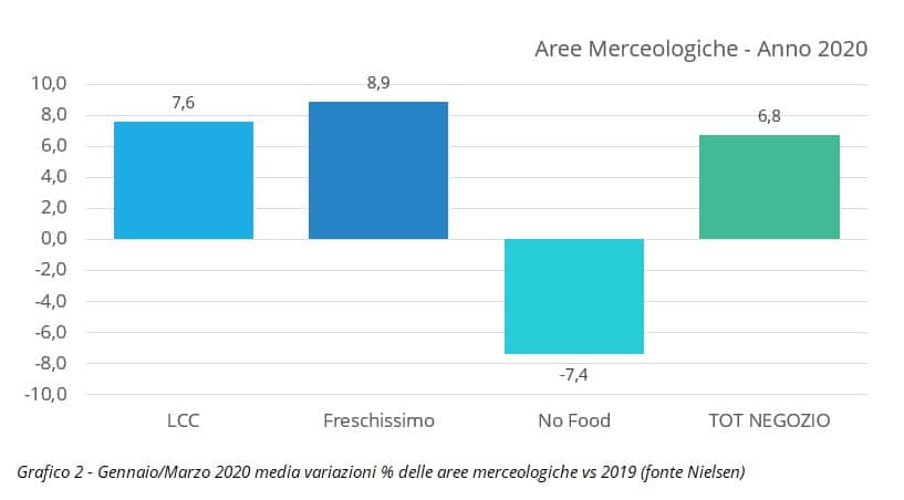 A questo faceva da contraltare un decremento importante del non food (-7,4%) legato, appunto, alle chiusure forzate in casa e al limitare degli acquisti degli shopper alla spesa alimentare e di prodotti parafarmaceutici, oltre che alla grande crisi dei canali che sono tendenzialmente caratterizzati da un fatturato non alimentare significativo, come ipermercati, superstore e grandi discount.