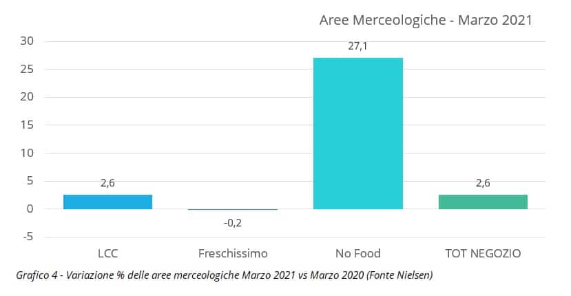 In un mercato che cresce, come quello della GDO nel primo trimestre del 2021, si riflettono anche le crescite delle singole aree merceologiche che, assieme, realizzano il fatturato, ed è curioso che quest'anno si stiano confermando incrementi anche sui risultati ottenuti lo scorso anno, in piena pandemia.