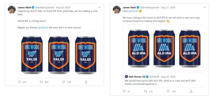 James Watt, fondatore di BrewDog noto per la sua sagacia sui social, non ci ha pensato due volte e ha annunciato la produzione di una nuova Ipa a marchio BrewDog, (YALDI IPA) chiedendosi se il colosso della GDO tedesco sarebbe stato disponibile a venderla nei suoi canali. La risposta, sempre a mezzo Twitter, non tarda ad arrivare. Aldi UK propone di cambiare il nome in ALD IPA e di parlarne insieme davanti ad una birra.