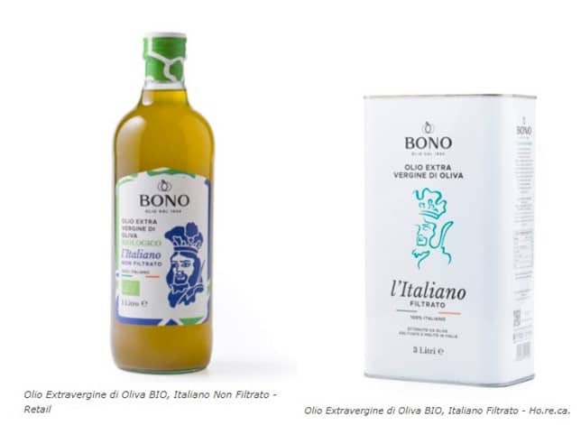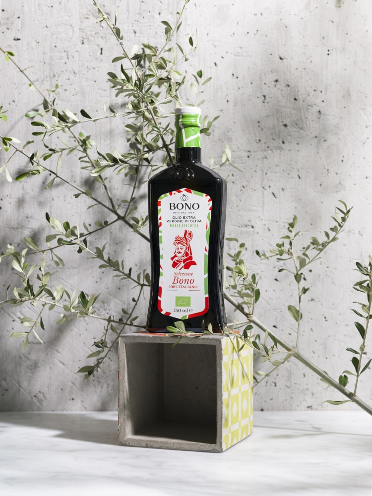 La linea biologica Bono è il frutto di cultivar italiane e siciliane Dop e Igp provenienti da agricoltura biologica,  quindi coltivate senza l’utilizzo di prodotti chimici, che rispettano l’antica arte olearia e la tradizione italiana. La gamma bio comprende cinque referenze. L’Olio Selezione Bono, nei formati da 750 ml e 500 ml con dosatore, 500 ml e 250 ml con anti rabbocco, dal carattere vigoroso è ideale per condire qualsiasi pietanza, in particolare carne e minestre. A questo olio è stato associato il coraggioso e sincero Orlando, l’eroe dell’Opera dei Pupi, prototipo del paladino della Cristianità.