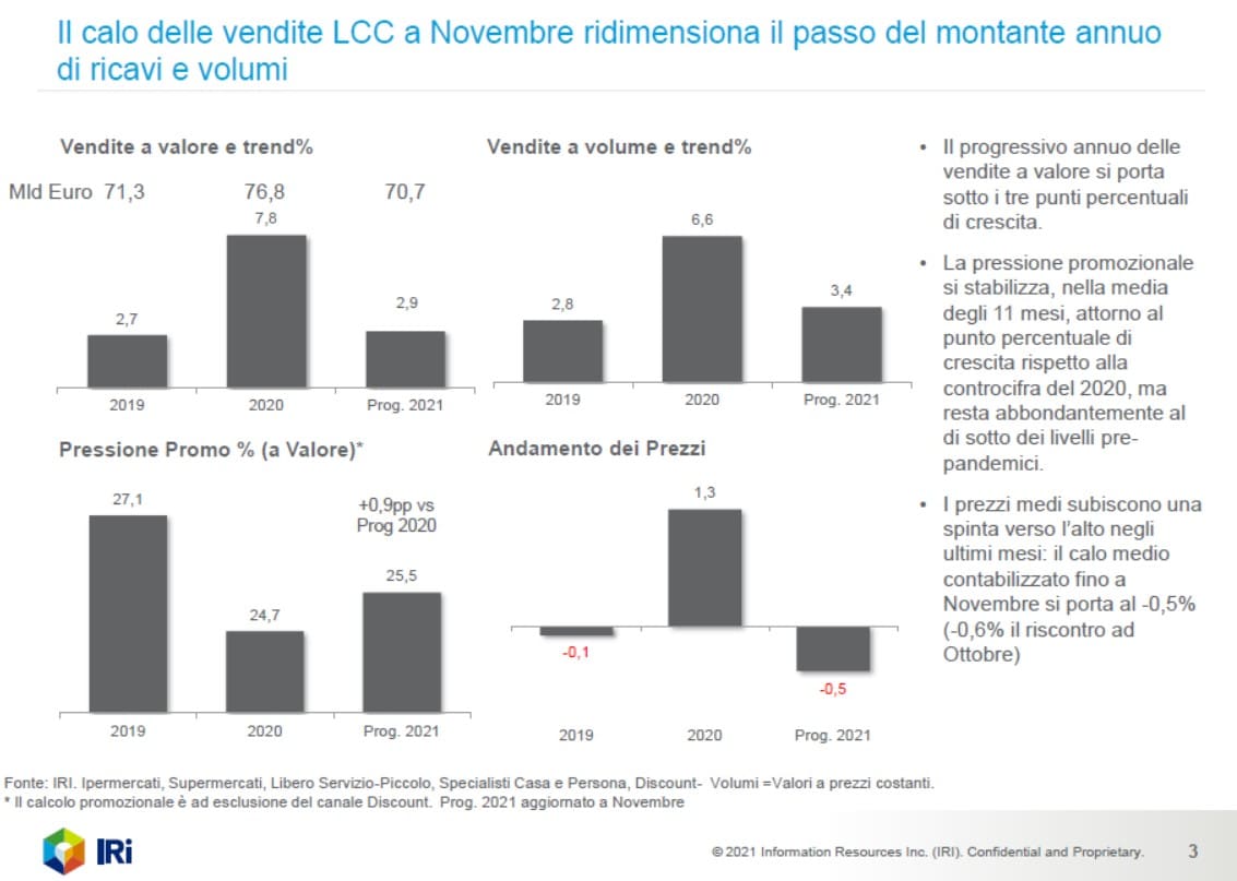 La quarta ondata di Coronavirus e l'aumento dell'inflazione stanno avendo ripercussioni anche sulle vendite del Largo consumo confezionato, il cui dato progressivo aggiornato al mese di novembre secondo il noto Istituto IRI segna un calo delle vendite, in un 2021 in cui il trend a valore resta sotto i tre punti percentuali ma in positivo.