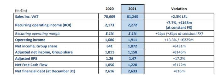 Nell’anno appena trascorso, sono cresciuti nuovamente tutti i segmenti, sulla scia della base record del 2020. Le vendite LFL sono aumentate del +1,8% (+2,4% nel settore alimentare, -1,7% in quello non alimentare). La quota di mercato è migliorata del +0,2%. Il Gruppo ha sovra-performato in ciascuno dei canali di riferimento: dagli ipermercati ai supermercati, fino ai “convenience” e ai Drive. L’e-commerce è cresciuto del 19% (+80% se raffrontato al 2019). I proventi operativi ricorrenti per il 2021 sono aumentati del +20,4% (+128 milioni di euro) raggiungendo i 757 milioni di euro, rispetto ai 629 milioni di euro del 2020. Il margine operativo è aumentato di +30 pb al 2,1%, dopo un miglioramento di +24 pb nel 2020.