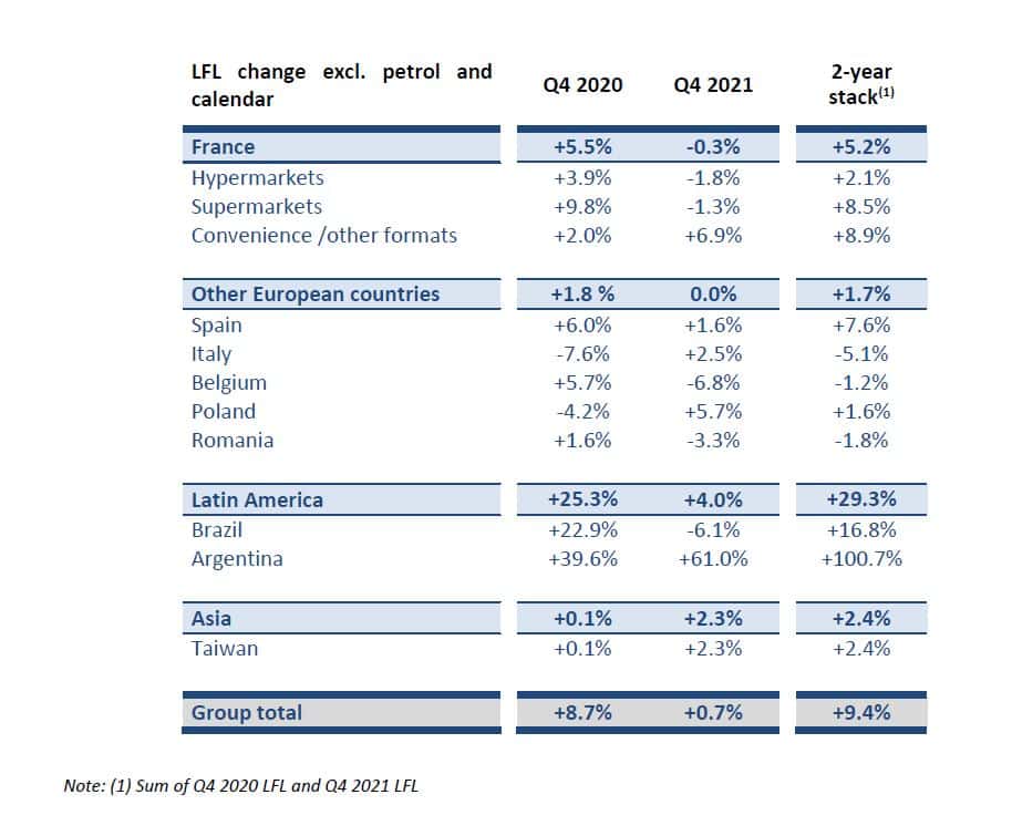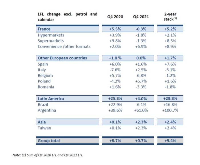In tema di espansione, va segnalata l’acquisizione del Gruppo BIG in Brasile, il cui closing è previsto per la fine del secondo trimestre 2022. Parallelamente, Carrefour ha continuato a ottimizzare il suo modello operativo con la cessione in affitto del ramo d’azienda, in Francia, di 10 ipermercati e 44 supermercati e ha annunciato un nuovo programma che riguarda altri 43 punti di vendita (16 ipermercati e 27 super) a partire da marzo 2022.