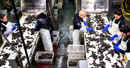 Se le Nieddittas sono sempre così fresche è perché il confezionamento avviene solo quando l’azienda riceve l’ordine di un cliente. Fino a quel momento le cozze restano in acqua. Una volta ricevuto l’ordine, vengono raccolte in mare e depurate; solo dopo entrano nella linea di confezionamento.