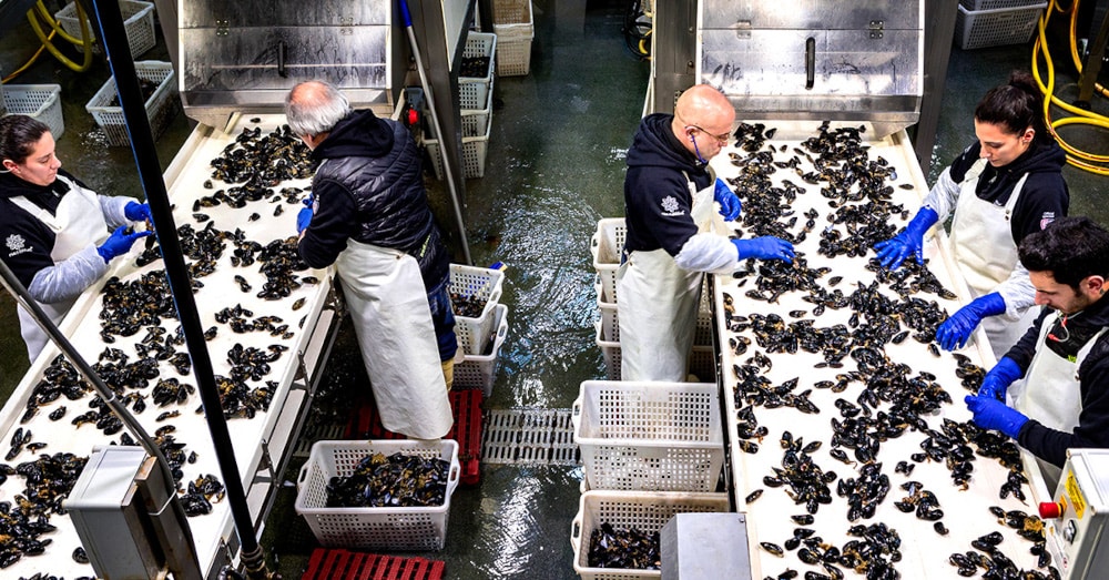 Qui avviene la prima selezione manuale, che elimina le cozze inadatte alla commercializzazione perché rotte o troppo piccole. Al termine della linea le cozze selezionate vengono confezionate nelle tipiche retine e preparate per il trasporto e la consegna alle piattaforme ittiche. In ogni retina viene inserita l’etichetta con tutte le indicazioni (provenienza, numero lotto, data di confezionamento, etc) che in caso di necessità consentiranno la rintracciabilità di tutto il percorso di lavorazione.