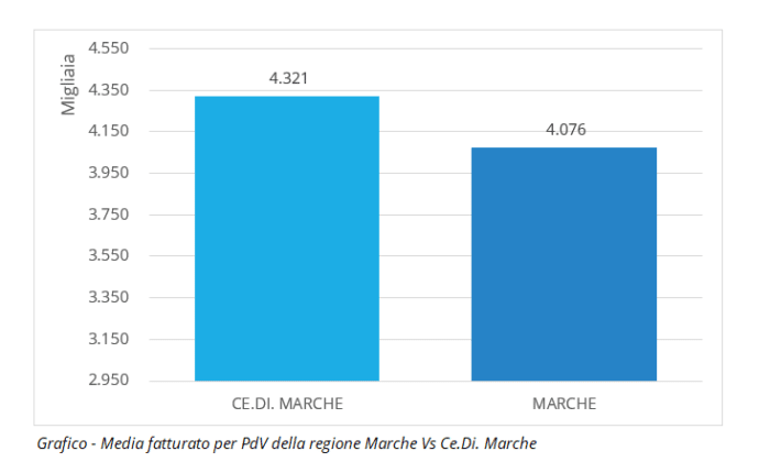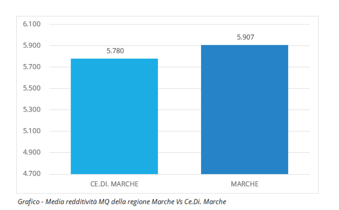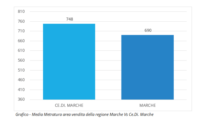 Il fatturato medio per punto vendita della regione è circa 4.000€ mentre la media di Ce.Di. Marche è leggermente superiore (4.300€). La metratura media dei suoi negozi non è bassa, misura circa 750 mq contro i 690 media regionale. Sulla redditività per Mq cede qualcosa (5.780 contro 5.900 media regionale) ma deve essere considerata la presenza dei discount che nella regione è rilevante (vedi apposito articolo sulle quote in Marche e Abruzzo) così come competitiva è la presenza dei Conad.