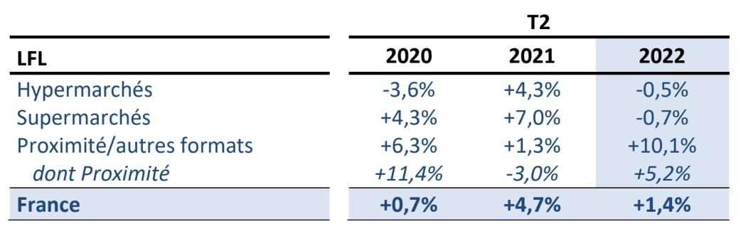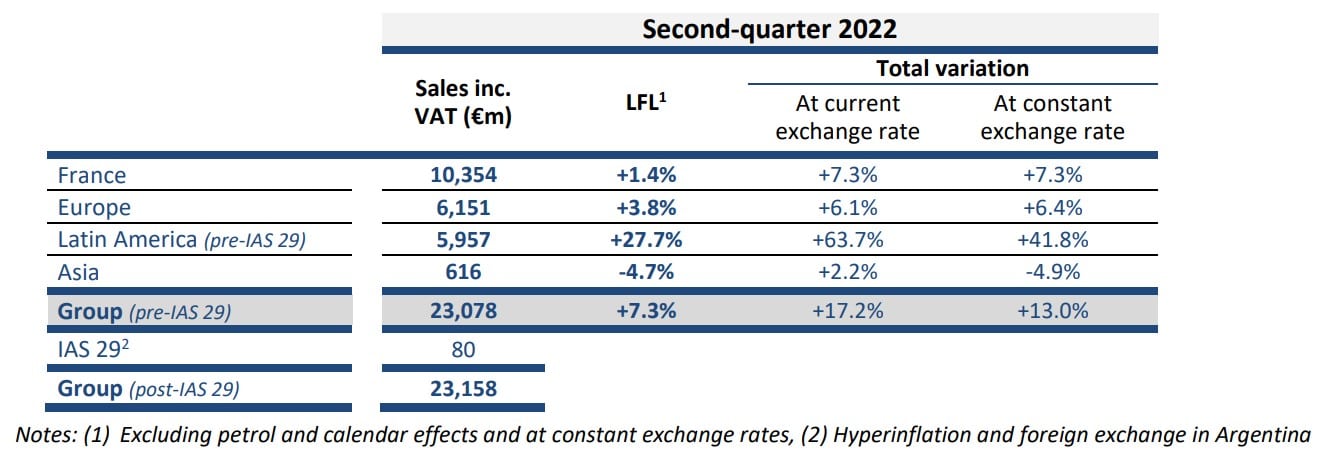 Le vendite del gruppo sono aumentate del +7,3% su base comparabile nel secondo trimestre (+8,1% LFL su a alimentare, +2,9% LFL nel non alimentare), riflettendo il solido slancio commerciale, in un contesto inflazionistico, e la rilevanza del modello multiformato e omnicanale. Tale prestazione viene raggiunta su basi di confronto elevate con una crescita del +3,6% LFL nel secondo trimestre del 2021 e del +6,3% nel secondo trimestre del 2020.