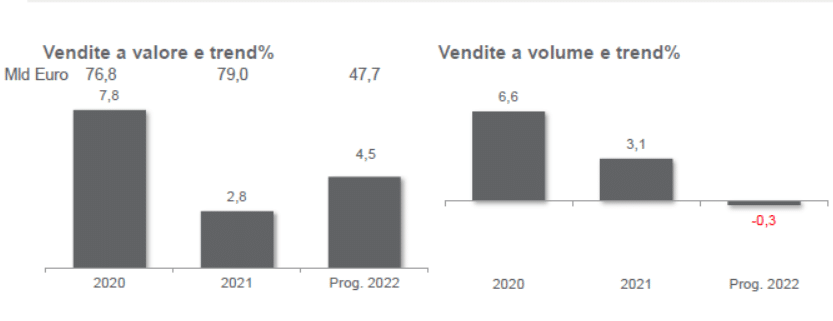 Il prossimo futuro appare quanto mai incerto, ma non vi è dubbio che le vendite in grande distribuzione, in questo 2022, stanno andando meglio del previsto, tenuto conto che il confronto è con i primi sette mesi dello scorso anno, il periodo della coda pandemica che portò numeri più che confortevoli almeno sino al mese di maggio.