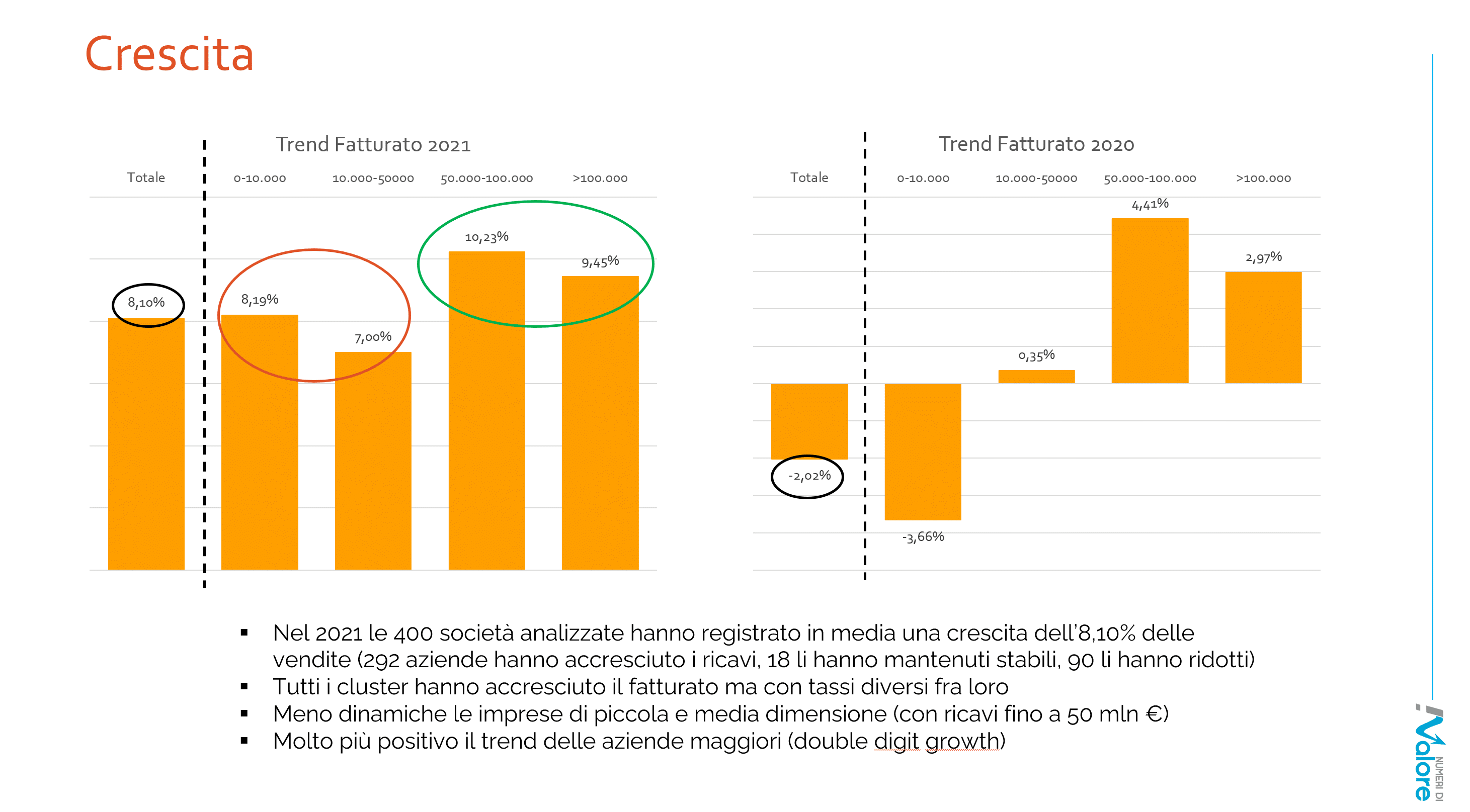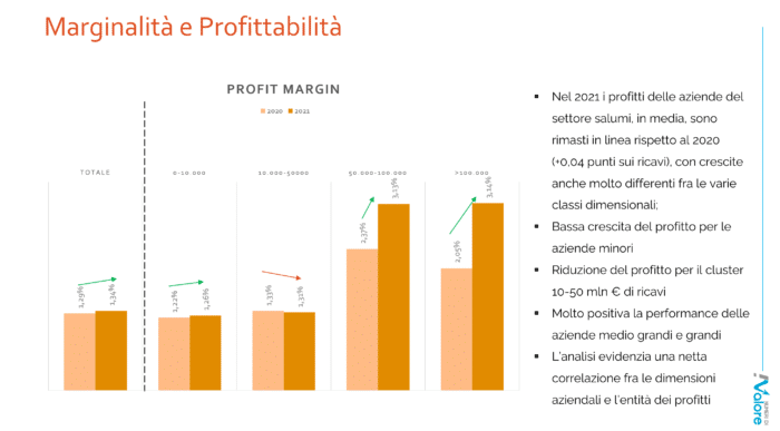 Il secondo aspetto è quello relativo ai margini operativi: nell’ultimo periodo di bilancio (2021) i profitti sono rimasti in linea con quelli del 2020, ma dentro questo dato medio è da sottolineare la forte evoluzione delle aziende medio grandi (da 50 milioni di ricavi in su) che hanno incrementato il loro margine operativo in media del 1%, nel dettaglio gli EBIT delle aziende da 50 a 100 milioni è passato dal 2,37% al 3,13% e quelle oltre i 100 milioni dal 2,05% al 3,14%