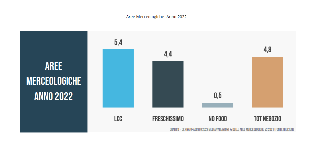 Dal primo gennaio a fine agosto 2022 (dato progressivo) infatti il mercato ha realizzato una crescita molto buona, pari al 4,8%, con l’area del largo consumo confezionato – LCC – che si è sviluppata in modo più che proporzionale, arrivando al 5,4%, davanti ai freschissimi attestati al 4,4% e al no food il cui incremento è stato dello 0,5%. Dati che richiedono una lettura più attenta, ad iniziare dalla crescita, visto che i valori dell’incremento arrivano dopo un 2021 in cui, ad esempio, il largo consumo confezionato era in stagnazione (+0,1%).