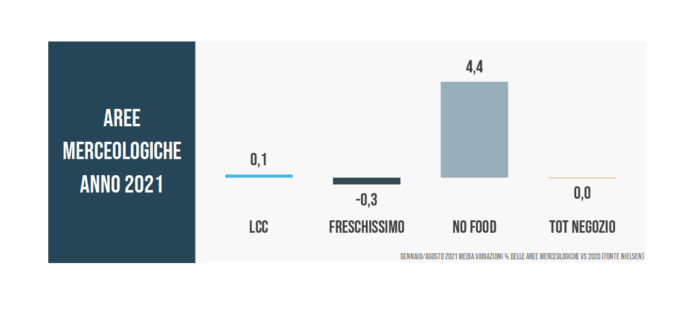 L’ultimo punto da analizzare è quello del no food con il suo +0,5%, conseguenza del +4,4% del 2021. Si tratta dell’evoluzione positiva di un mercato che, se un tempo aveva più senso nei formati di vendita molto grandi, oggi dopo un’opera di “pulizia” dell’offerta è tornata un’area di business in crescita.