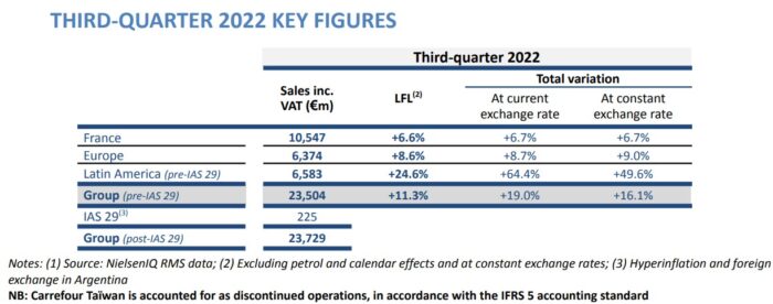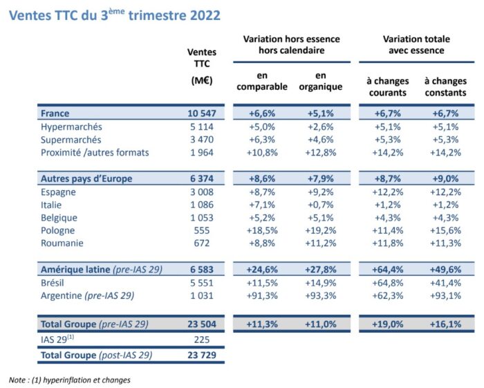 - Il rafforzamento delle proprie dinamiche promozionali, sia in termini di numero di promozioni che di inlivello di sconto e l’attrattiva del suo programma fedeltà Le vendite del gruppo sono aumentate del +11,3% LFL nel terzo trimestre (+12,2% LFL nel settore alimentare, +6,4% LFL nel settore non alimentare), riflettendo un solidodinamiche commerciali e la rilevanza del nostro modello multiformato e omnicanale in un contesto inflazionistico.