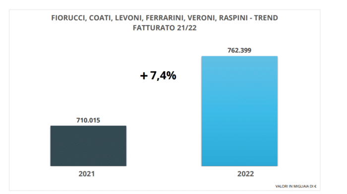 Il fatturato complessivo 2022 delle imprese in analisi, tutte di dimensioni superiori ai 100 milioni di euro, è aumentato del 7,4% rispetto al 2021, raggiungendo i 762 milioni di euro rispetto ai 710 milioni dell’anno precedente. Questo aumento, inferiore alla media della categoria, è in gran parte dovuto all’effetto dell’aumento dei prezzi causato dall’inflazione.