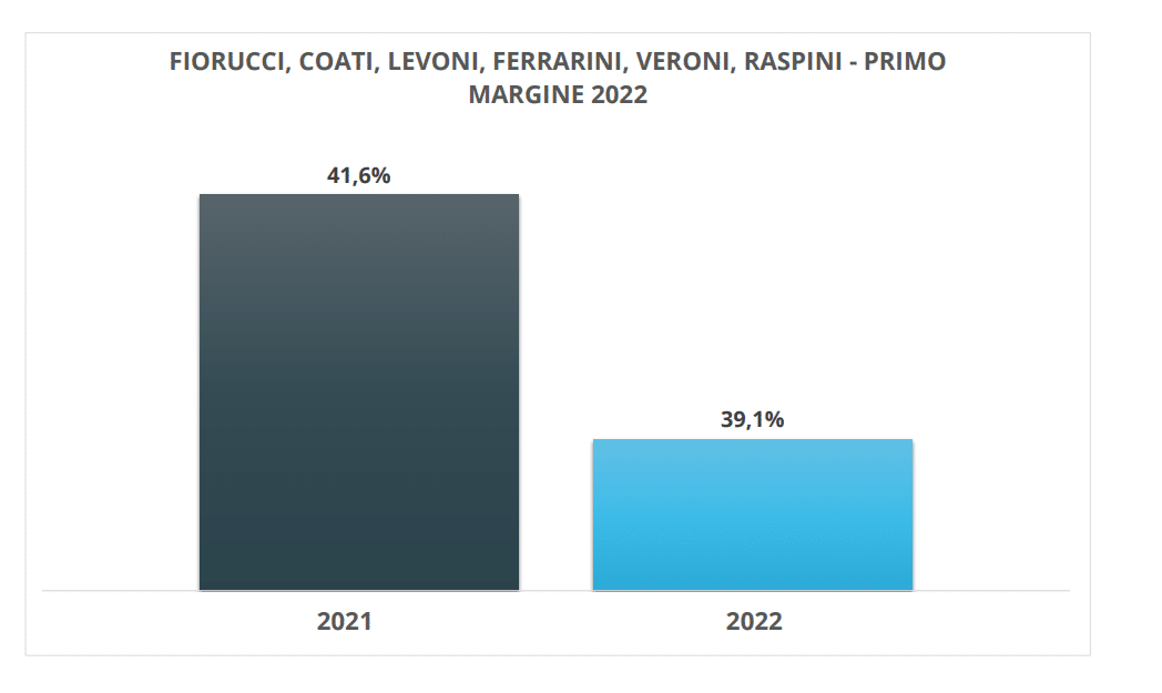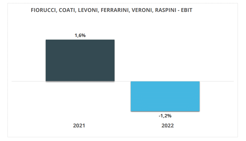 Nel 2022, tutte le imprese hanno riportato indicatori tra l’uno ed il due per cento. Raspini ha un EBIT margin appena sopra l’1%, mentre Levoni ha l’1,62%. Coati, Ferrarini e Fiorucci si collocano tra il 2,5% e il 3%.