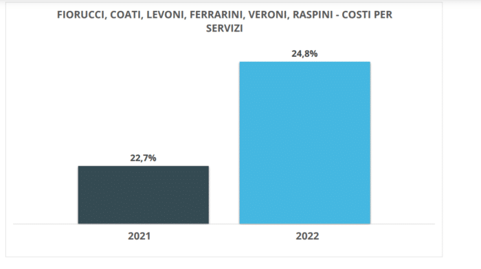 Dall’altra parte, Fiorucci, con l’EBITDA margin peggiore del benchmark al 1,14%, ha registrato un aumento delle spese per servizi del 35% e costi del lavoro del 16%.